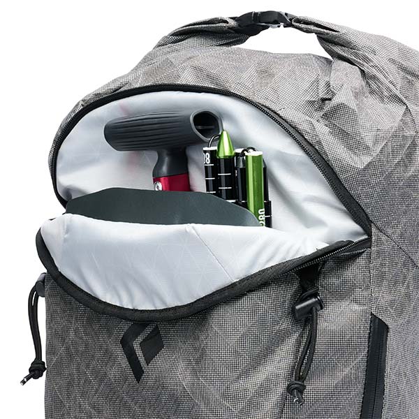 C’est un sac technique mais très épuré dont les fonctionnalités répondent parfaitement à la pratique du ski de rando. Il est doté d'un compartiment principal à fermeture par enroulement et un zip vertical permet également un accès rapide au contenu du sac. Le compartiment est divisible par une cloison amovible afin de créer une poche pour les peaux et crampons dans le bas du sac et qui est accessible de l'extérieur grâce au zip vertical.